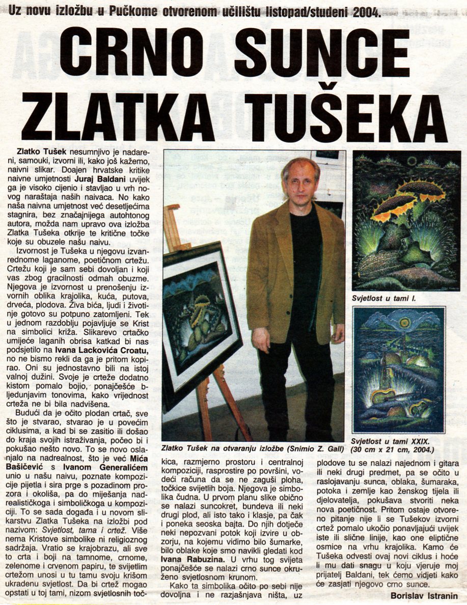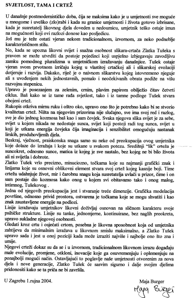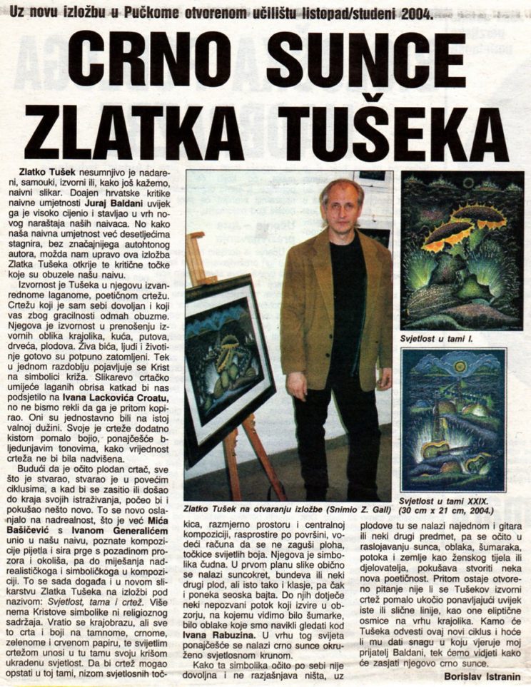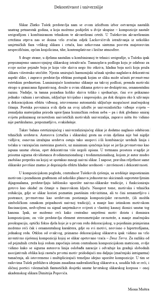 Mediji Dekorativnost i univerzalije – Miona Muštra Crno sunce Zlatka Tušeka – Borislav Istranin Zlatko Tušek – Juraj Baldani Svjetlost, tama i crtež – Maja Burger Zlatko Tušek – Pjesnik tišine Skip back to main navigation